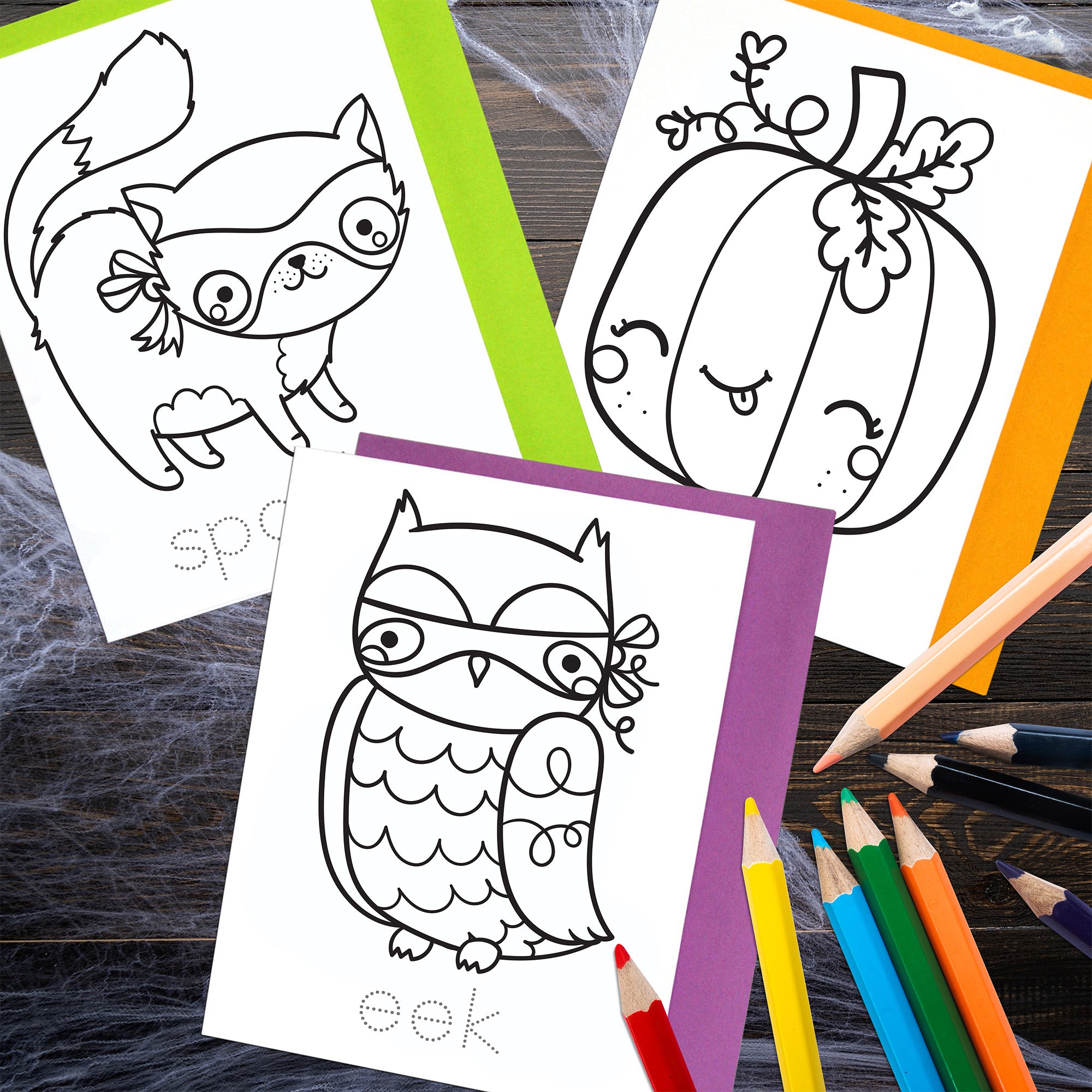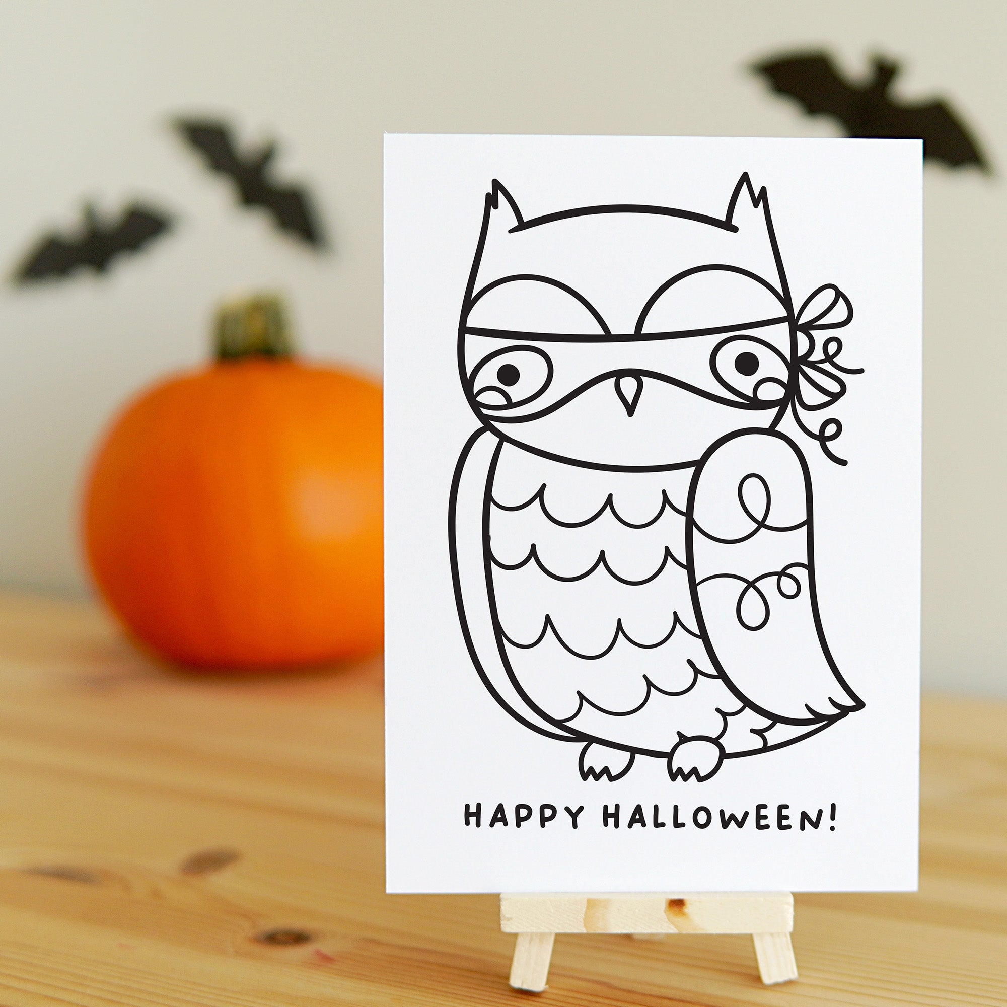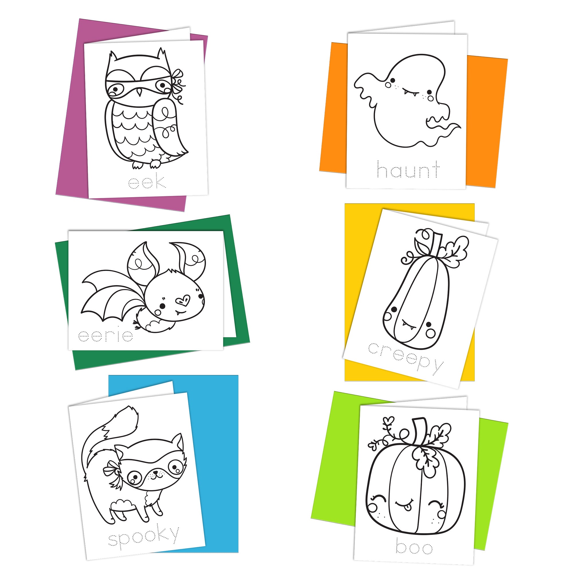 Halloween Cards with cute Kawaii style illustrations. Perfect for all ages to color and wish Happy Halloween to friends and family.
